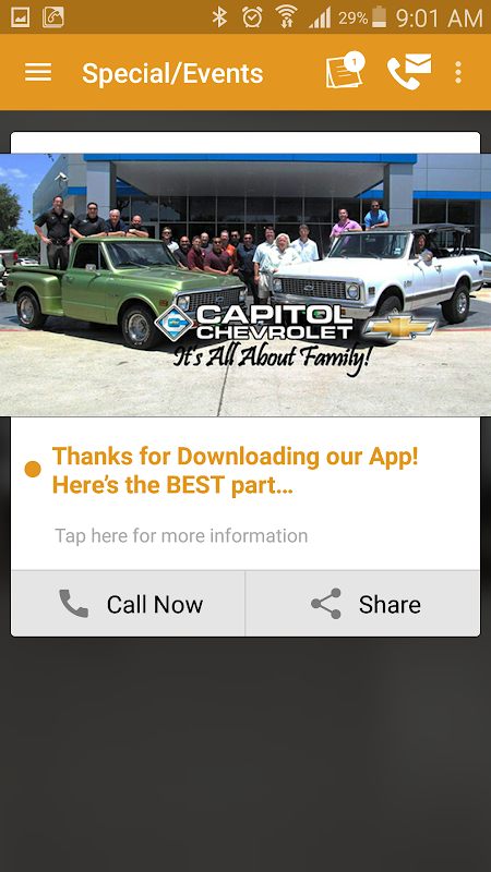 In addition, all the standard Dealership App features are also here like: Call and email each department, get directions, view operating hours, get quotes on vehicles, order parts, etc etc…