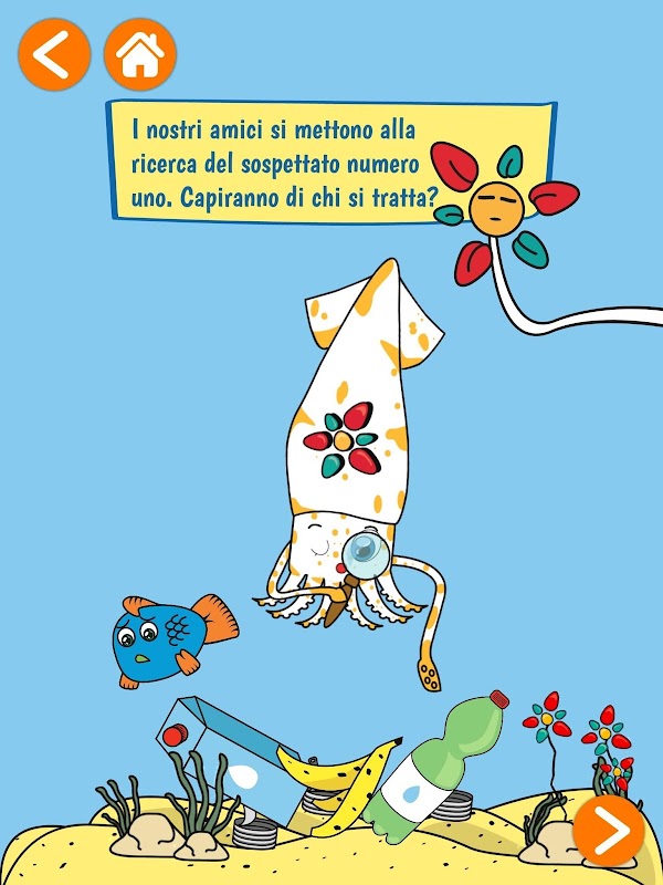Attraverso il racconto e i giochi, i vostri bambini potranno imparare a riconoscere gli oggetti e a gestire la raccolta differenziata; ogni fase della storia prevede un’attività ludica complementare, il cui superamento comporta l’avanzare della storia e la possibilità di accedere agli altri giochi.