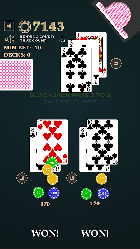 Mô phỏng các quy tắc sòng bạc thực tế: số lượng bộ bài, tần suất xáo bài, hành vi của người chia bài, v.v. Hoàn hảo để thực hành các chiến lược đếm bài trong điều kiện thực tế.