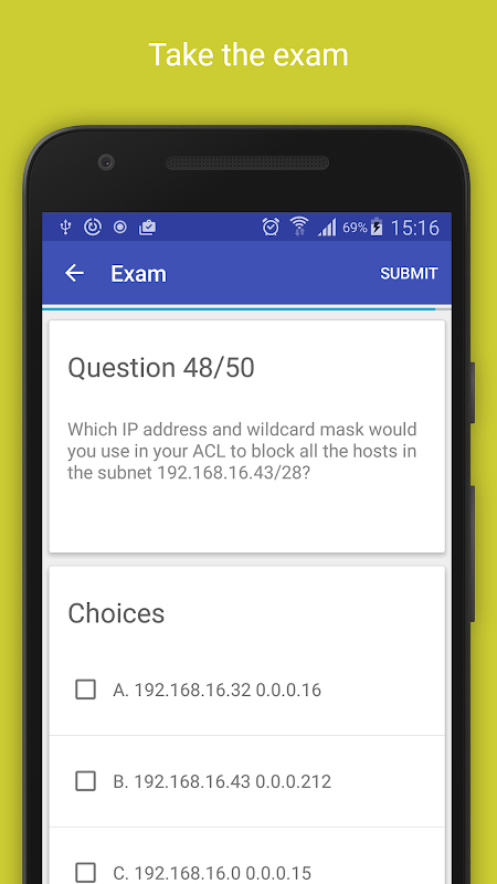 - Test Mode consists of a simulation of the real exam. The questions are randomly generated each time. User can check the result, see the correct answer and the explanation after finishing the exam.