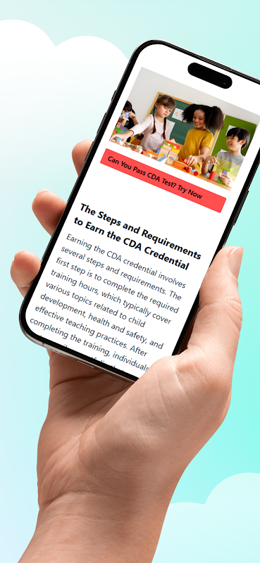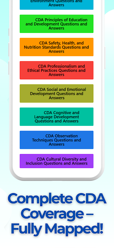 Cho dù bạn đang chuẩn bị cho chứng chỉ Mẫu giáo, Trẻ sơ sinh/Trẻ mới biết đi hay Chăm sóc trẻ em tại gia đình, ứng dụng này đều hỗ trợ bạn thành công. Thực hành với các bài kiểm tra hoặc làm bài kiểm tra thử CDA toàn diện mô phỏng trải nghiệm thi thực tế.