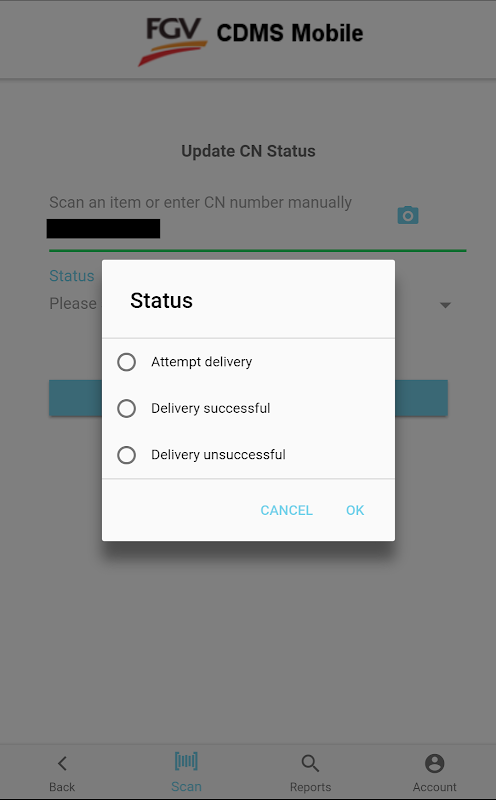 Ứng dụng di động được phát triển cho Dịch vụ Chuyển phát nhanh FGV để theo dõi và cập nhật trạng thái lô hàng của họ.
