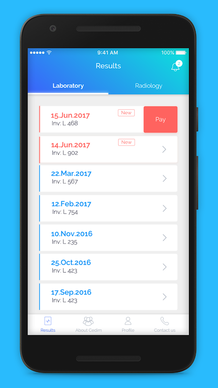 Với ứng dụng CEDIM bạn sẽ nghỉ ngơi và chúng tôi sẽ gửi cho bạn các báo cáo y tế của bạn. Không phải chờ đợi trong dòng cho giờ để thu thập các báo cáo của bạn. thoải mái của bạn là mối quan tâm của chúng tôi. ứng dụng CEDIM cho phép bạn có quyền truy cập vào kết quả của bạn bất cứ khi nào và bất cứ nơi nào bạn cần. Bạn có thể xem kết quả mới của bạn sau khi thực hiện kiểm tra trong phòng thí nghiệm, thêm vào những người trước đây của bạn.