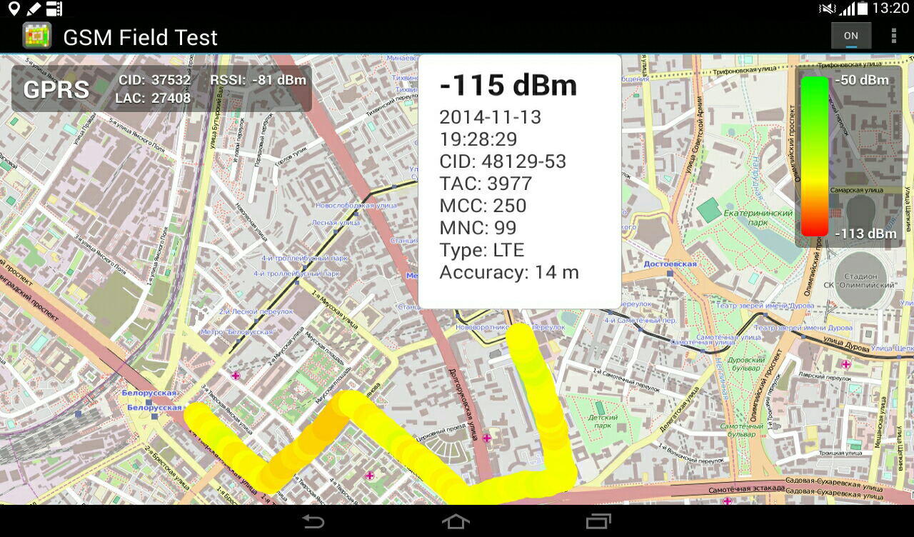 Cell Coverage Map is an application for experts in cellular communication and enthusiasts that helps to create a coverage map of mobile network (GSM/UMTS/LTE) by mapping markers of a color depending on the level of the received signal at a particular location.