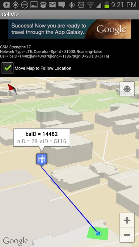 • Verizon, in particular, seems to often provide bad data for tower locations, which CellViz will filter out. In this case, you'll see cell signal quality info on the mobile map and in Google Earth (i.e., same as GSM), but not tower icons or lines.
