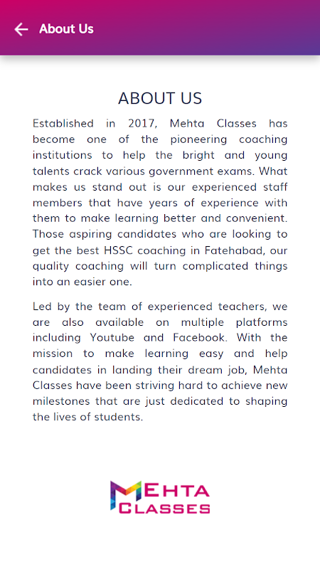 Được dẫn dắt bởi đội ngũ giáo viên giàu kinh nghiệm, chúng tôi cũng có sẵn trên nhiều nền tảng bao gồm Youtube và Facebook. Với sứ mệnh giúp cho việc học tập trở nên dễ dàng và giúp các ứng viên có được công việc mơ ước của mình, Mehta Classes đã và đang nỗ lực hết mình để đạt được những cột mốc quan trọng mới dành riêng cho việc định hình cuộc sống của sinh viên.