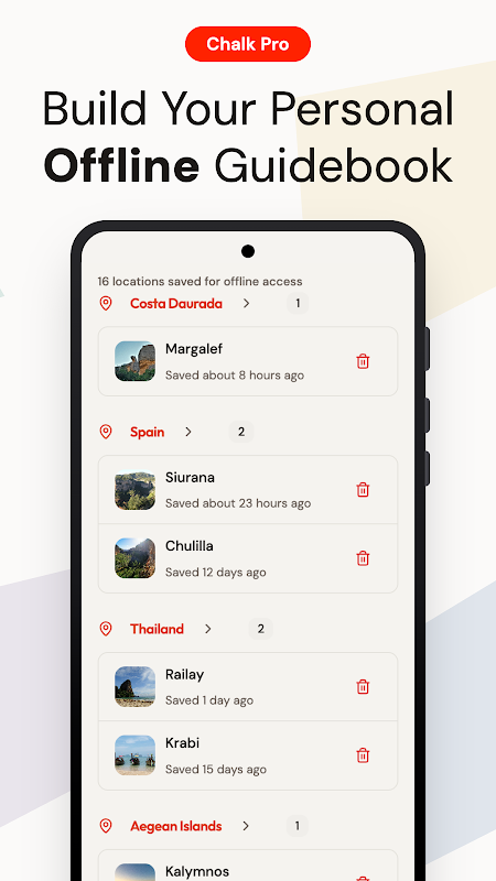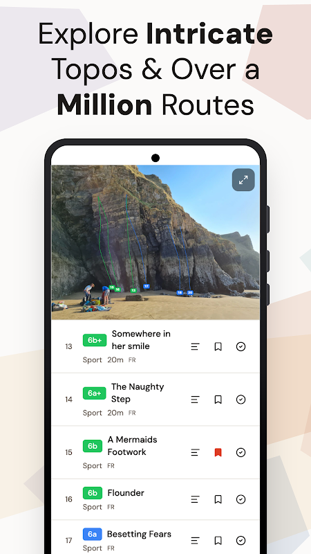 Tải xuống các vách đá và tuyến đường để truy cập ngoại tuyến. Đến các vách đá xa xôi mà không cần lo lắng về tín hiệu - bản đồ địa hình, thông tin tuyến đường và nhật ký của bạn sẽ đi cùng bạn.