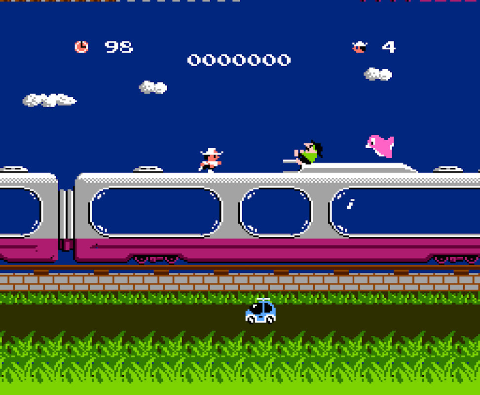 The first level is titled "STOP THE EXPRESS!". The villain, Don Waldorado, has abducted Princess Maria, and is escaping on a special express train. Challenger heads for the front train car while avoiding Waldorado's cronies, but Waldorado cuts off the connection between the rear train cars and escapes after pushing Challenger off the train.