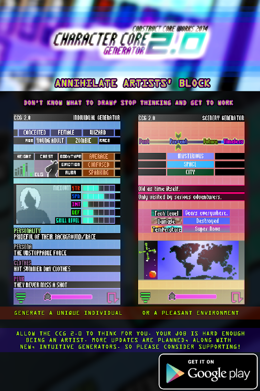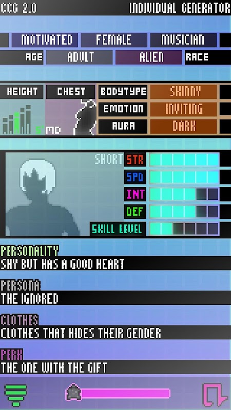 The CCG 2.0 generates a random set of descriptions, ranging from persona, emotions, strengths, professions. Everything you would need to imagine a unique character. There is also an RPG style meter, showing things like STR, SPD, INT, and things like that which are bound to help you understand your random character more.