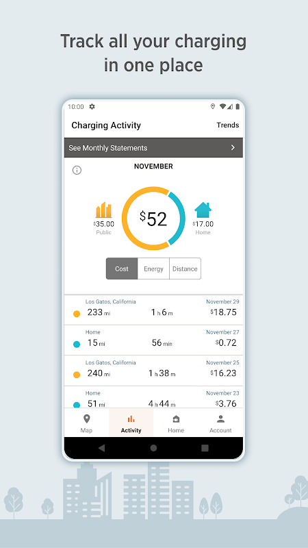 Xem lịch sử và xu hướng tính phí của bạn, bao gồm số dặm đã thêm và chi phí. Dễ dàng kiểm soát cả sạc công cộng và sạc tại nhà trong một ứng dụng duy nhất.