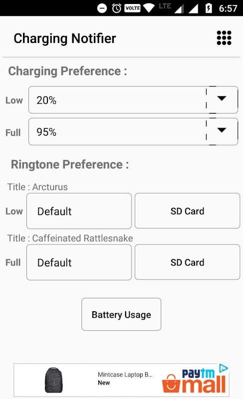 Sạc thông báo là dễ sử dụng tiện ích mà sẽ giúp bạn tiết kiệm rất nhiều rắc rối và tiền của việc nhận được pin mới do pin quá tải chết. Đơn giản chỉ cần cấu hình tỷ lệ phần trăm phí tối thiểu và tối đa của bạn. Hãy lo lắng miễn phí. Sạc thông báo sẽ thông báo cho bạn ngay sau khi nó đạt đến mức sạc pin mong muốn.