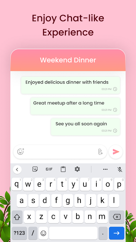 Ứng Dụng Nhật Ký Trò Chuyện - Daily Journal là một ứng dụng độc đáo và thú vị để bày tỏ cảm xúc và ghi lại những suy nghĩ của bạn. Làm cho các sự kiện của bạn trở nên đặc biệt và đáng nhớ hơn.