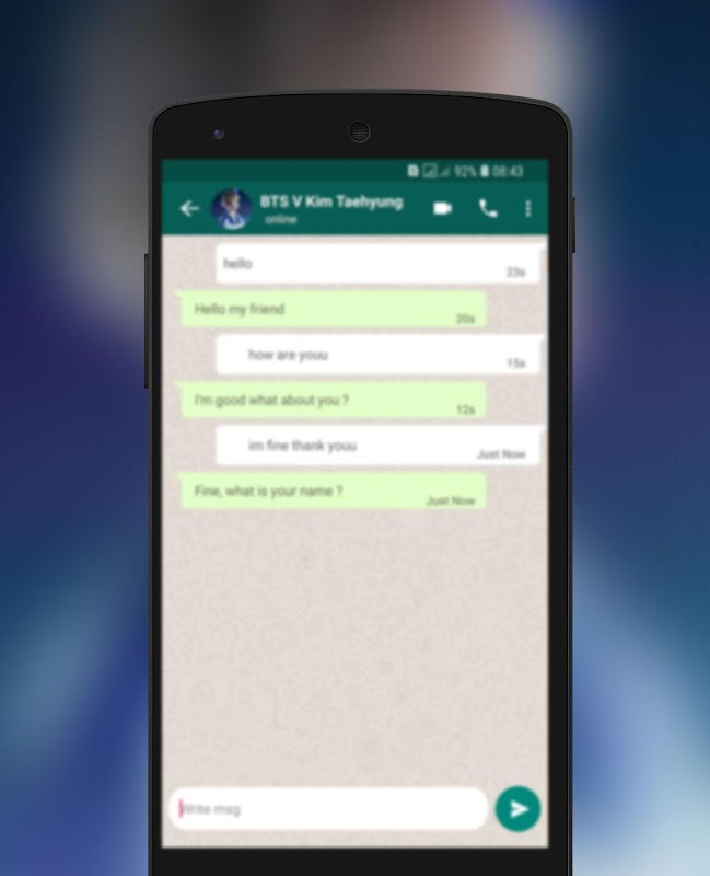 Live Chat With BTS V Kim Taehyung - Prank App for simulating chat conversations. Have fun with your friends making them believe you are actually chatting BTS V Kim Taehyung.