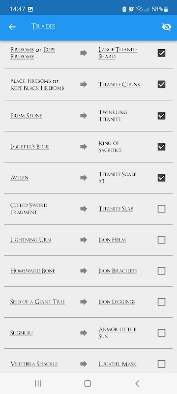 Bạn có thể kiểm tra cách chơi, thành tích, vũ khí / lá chắn, áo giáp và giao dịch của mình. Tất cả đều có liên kết đến DS Wikipedia.