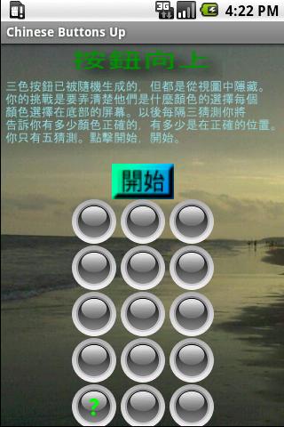 Chinese Display - Three colored buttons have been randomly generated but are hidden from view. Your challenge is to figure out what color they are. After every three guesses you will be told how many colors you got correct and how many are in the correct position. GOOD LUCK!