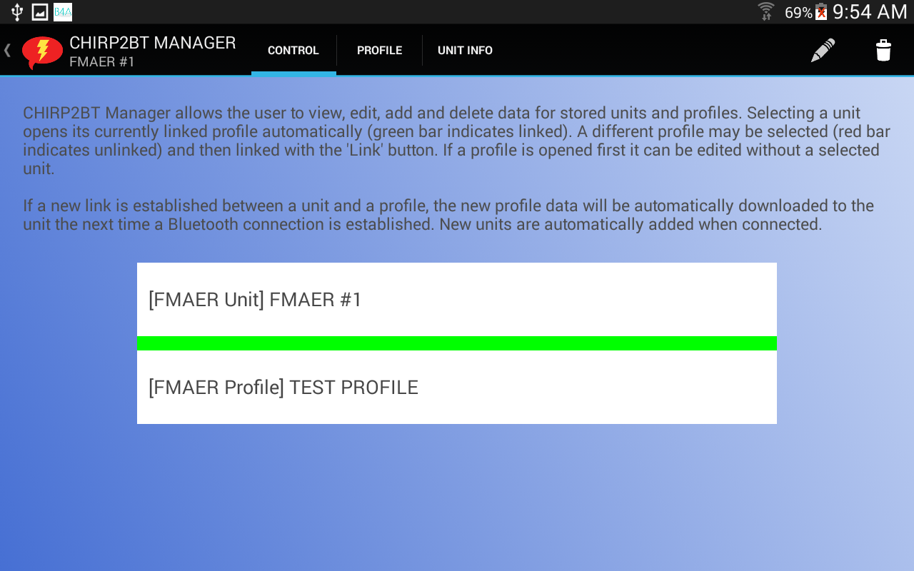 CHIRP2BT Remote connects via Bluetooth and recognizes all powered CHIRP2BT devices within an approximately 30ft radius and provides the opportunity to connect to one of them (FMAER or AER). Once connected, the app uploads connected device information including the installed (paired) profile ID and calibration details.