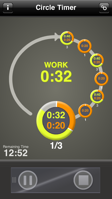 Specify the length of the first interval (Work) and the length of the second interval (Pause). Press Play.