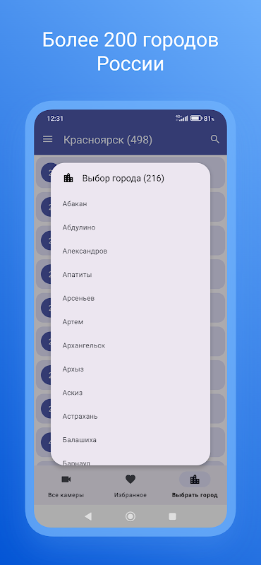 Ứng dụng giúp truy cập nhanh chóng và thuận tiện vào các camera giám sát công cộng trong thành phố (danh sách bên dưới). Để tiết kiệm dữ liệu, ngoài việc xem video, bạn còn có thể chụp ảnh màn hình từ camera. Có sẵn mục dành cho các camera yêu thích. Phóng to để xem video và ảnh chụp màn hình. Thông tin camera (chủ sở hữu, trang web, số điện thoại, địa chỉ). Nhiệt độ không khí. Xem tình trạng tắc nghẽn giao thông, xe của bạn trong bãi đậu xe, thời tiết và các địa danh. Các thành phố có sẵn (218):
