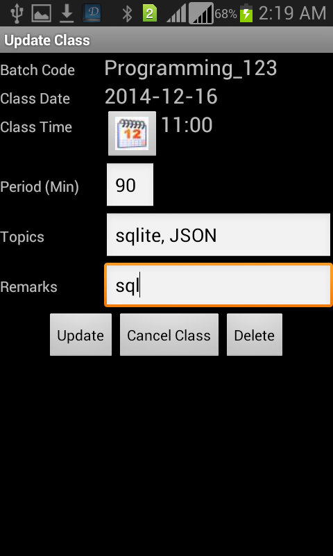 Students and teachers can use this app for scheduling their class or course time easily. there are updating, deleting, inserting options for classes and batches.