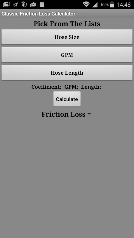 Use for training and for studying. The drop downs contain all the information you need to learn fire hydraulics and friction loss calculations. This calculator doesn't do total pressure loss or total pump discharge pressure. I may add that feature later but I'm not sure it is needed for a simple light weight friction loss calculator.