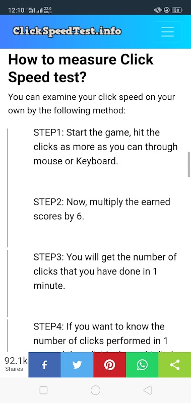 I think that the click speed test is a self-defining thing. You click, click and click for the limited period of time. In this test, you check your clicking speed (CPS rate). Make click until your hand, arm or wrist starts to vibrate. The average time for the CPS is about 60 second. Make hit fast and maximum as you can. The number of hits will define your success or loss.
