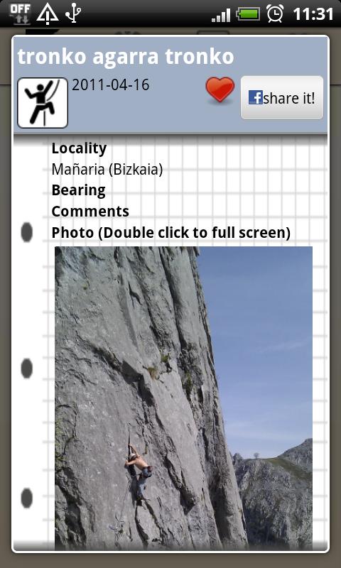 climbdroid sẽ giúp bạn trả lời những câu hỏi này, và theo dõi tất cả (leo núi, leo núi, trad, leo núi đá) tuyến đường mà bạn đã leo lên. Theo chi tiết như bạn muốn. Nó cũng sẽ cung cấp cho bạn các tùy chọn của việc có ít tay topo của các vách đá cheo leo và các lĩnh vực mà bạn thường ghé thăm, hoặc tìm những cái mới.