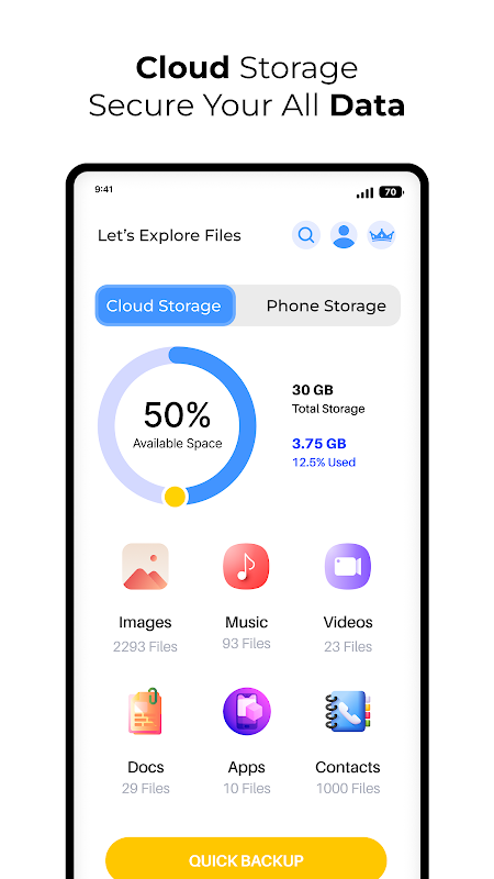 Với ứng dụng tệp sao lưu lưu trữ đám mây, hãy nhanh chóng tải ảnh, video, tài liệu và tệp của bạn lên ổ lưu trữ đám mây. Nó sẽ không mất nhiều thời gian. Chỉ cần mở ứng dụng lưu trữ đám mây, chọn dữ liệu bạn muốn tải lên ổ lưu trữ đám mây và nhấn nút tải lên. Tất cả các tệp di chúc của bạn sẽ được tải lên không gian lưu trữ tệp trên đám mây. Bạn có thể truy cập dữ liệu của mình từ ổ đĩa đám mây mọi lúc mọi nơi.