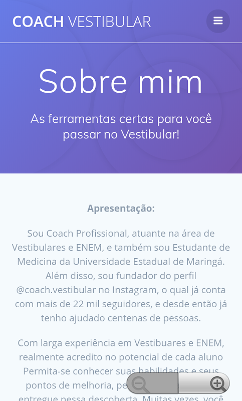 Sou Coach Profissional, atuante na área de Vestibulares/ENEM, e também sou Acadêmico de Medicina da Universidade Estadual de Maringá. Além disso, sou fundador do perfil @coach.vestibular no Instagram, o qual já conta com mais de 30 mil seguidores, e desde então já tenho ajudado milhares de alunos. Confira meu site www.coachingvestibular.com.br