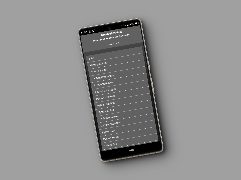 Chào mừng bạn đến với "CodeCraft Python", hướng dẫn toàn diện để bạn thành thạo lập trình Python ngay từ đầu! Cho dù bạn là người mới bắt đầu hay đang tìm cách nâng cao kỹ năng viết mã của mình, ứng dụng này là người bạn đồng hành đáng tin cậy trên hành trình trở thành trình hướng dẫn Python.