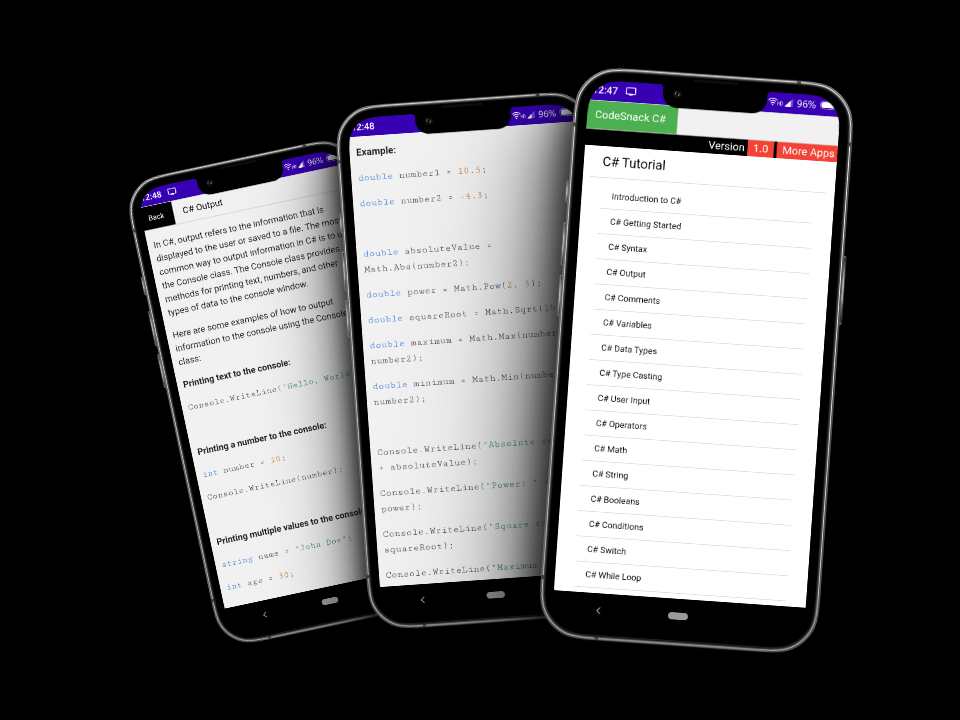 Chào mừng bạn đến với "CodeSnack C#", nơi bắt đầu hành trình làm chủ ngôn ngữ lập trình C# của bạn. Cho dù bạn là người mới viết mã hay đang tìm cách nâng cao kỹ năng của mình, ứng dụng này được thiết kế để trở thành người bạn đồng hành cùng bạn trong quá trình trở thành nhà phát triển C# thành thạo.