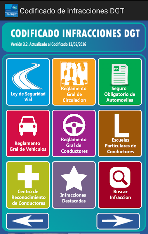 DGT vi phạm mã dẫn. Nó chứa các cải cách quan trọng nhất của Đạo Luật An toàn đường bộ. Hoàng Lập pháp Nghị định 6/2015 của 30 tháng 10, phê duyệt các văn bản sửa đổi của Luật giao thông, phương tiện cơ giới giao thông và an toàn đường bộ đã được phê duyệt. Ứng dụng này cho phép thấy vi phạm giao thông xuất bản trong hướng dẫn hành vi vi phạm được mã hóa được công bố bởi Tổng cục giao thông. Gán các mục yêu thích các vi phạm phổ biến nhất hoặc thông thường. Ngoài utliza các màu sắc tương tự vi phạm pháp luật và các quy định khác nhau để làm cho nó dễ dàng hơn để sử dụng cho những người quen thuộc với các hướng dẫn người sử dụng.