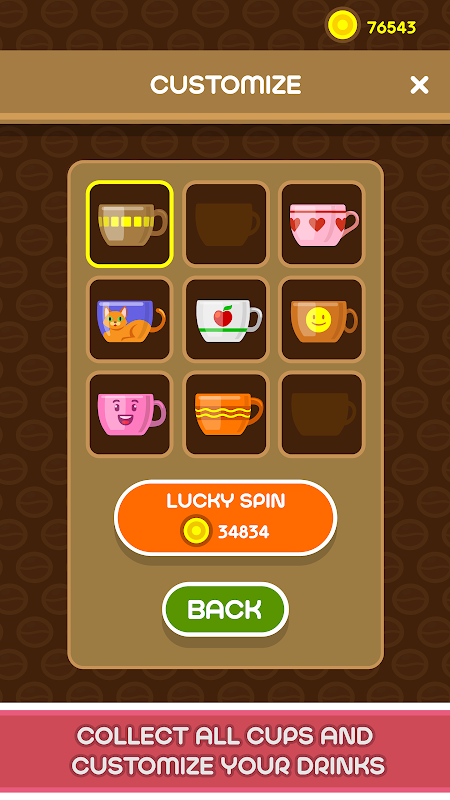 Earn coins and get all the skins and cups to customize your coffee drinks.