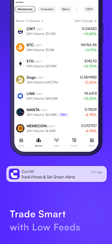 Mua và giao dịch các loại tiền điện tử hàng đầu trên CoinW. Truy cập +1000 coin chỉ trong vài giây.