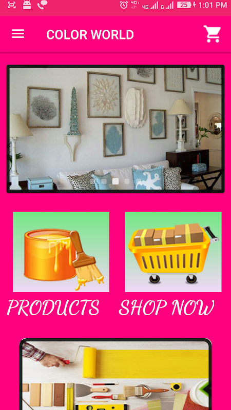 “Color world app” helps the people to reduce the time complexity as well as burden to visit in shop. As I have analyze so many difficulties faced by folks related to buy paint and related to buy stuff online in this modern era, so I have decided to make application of paint store where customers can easily buy the paint on internet instead of using traditional way of purchasing wall paint via going to shops .I observed it is more cumbersome method which is used to very time consuming . With the help of “Color World” app consumer are able to acquire paint at any time and any where . This app provide the facility of clients to register in it and after registration they can login with their account ,in addition to it, masses can select the items in add to card then they can buy through online transaction. Moreover, admin login is available where they are able to add category , add products and products.