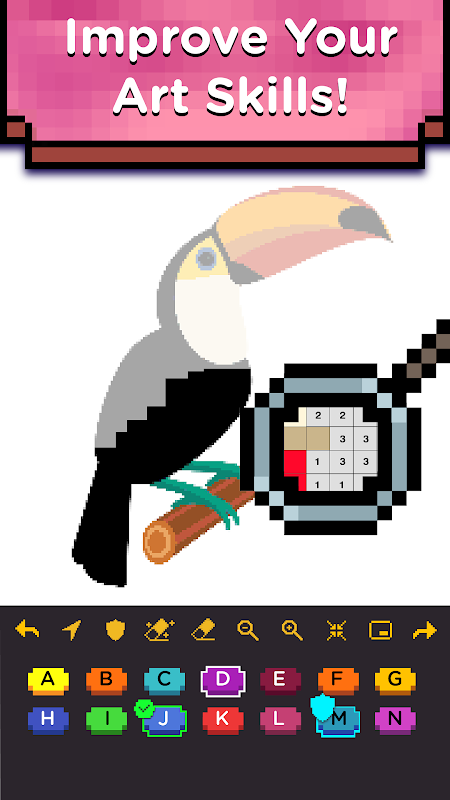 ColorPix: Pixel Art - Color by Numbers Game! app is a color-by-number and color-by-letters app that presents coloring pages with color legends which users fill in pixel by pixel. After you download the Pixel Art Game, you will see lots of greyscaled pictures. These are the patterns for you to color them!