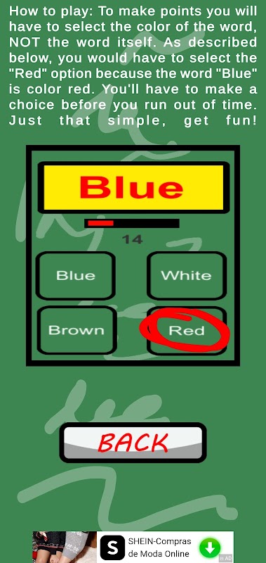 In this brain training game to get points you will have to select the right answer: the color of the word. Try to don't get confused by the word and the box color.
