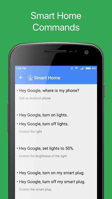 Ứng dụng này cung cấp danh sách đầy đủ các lệnh thoại cho Trợ lý Google và loa thông minh Google Home kích hoạt bằng cụm từ đặc biệt Ok Google hoặc Hey Google. Tất cả các lệnh thoại đều được phân loại.