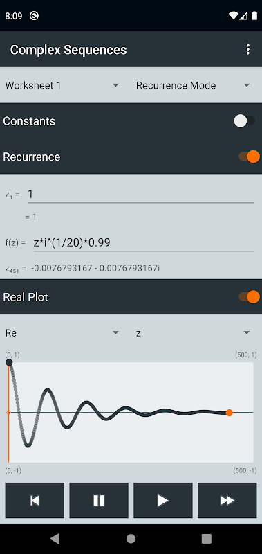 Các lô thực và phức tạp cung cấp phản hồi trực quan khi bạn bước qua một chuỗi. Cốt truyện thực có thể hiển thị Re (z), Im (z), Mod (z), Arg (z), Re (sum), Im (sum), Mod (sum) hoặc Arg (sum). Biểu đồ phức tạp có thể hiển thị giá trị chuỗi hoặc tổng một phần. Bạn có thể thay đổi chế độ cốt truyện tại bất kỳ điểm nào trong chuỗi, cho phép bạn thấy rõ các giá trị đang thay đổi theo thời gian như thế nào. Các lô làm cho ứng dụng này trở thành một công cụ vô giá để hiểu hành vi lâu dài của các chuỗi và chuỗi.