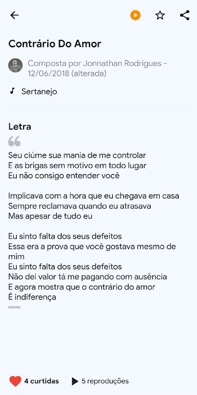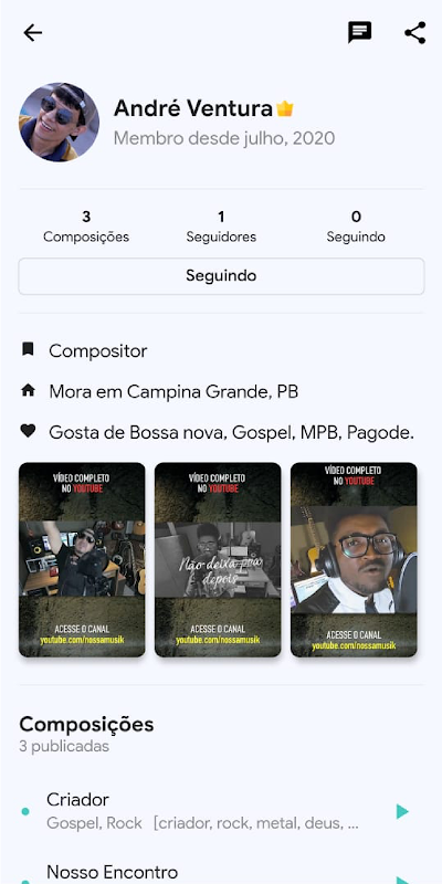 Nếu bạn không phải là một nghệ sĩ và thậm chí không tham gia vào các tác phẩm, hãy sử dụng Sáng tác để đánh giá cao sự đa dạng và phong phú của âm nhạc Brazil. Thưởng thức và chia sẻ những bài hát bạn thích nhất.