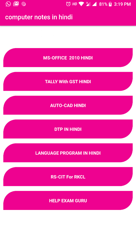 THIS APP ABOUT ALL COMPUTER COURSES C C++ JAVA MYSQL RS-CIT RKCL HELP HTML DTP PHOTOSHOP COREL DRAW AUTO-CAD CSS PROGRAMING AND OTHER IN HINDI LANGUAGE NOTES AND EBOOKS.