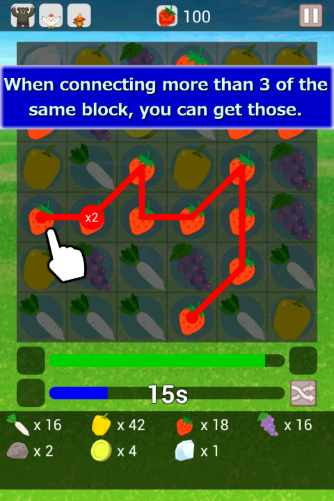 - When connecting more than 3 of the same block(Connect!), you can get those.
