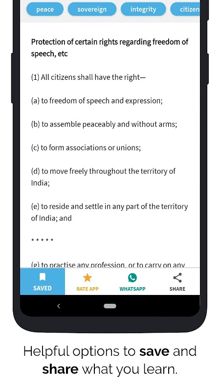 • Ứng dụng có tính năng chia sẻ để dễ dàng gửi các bài báo yêu thích, các sửa đổi và lịch biểu trong hiến pháp Ấn Độ cho bạn bè của bạn