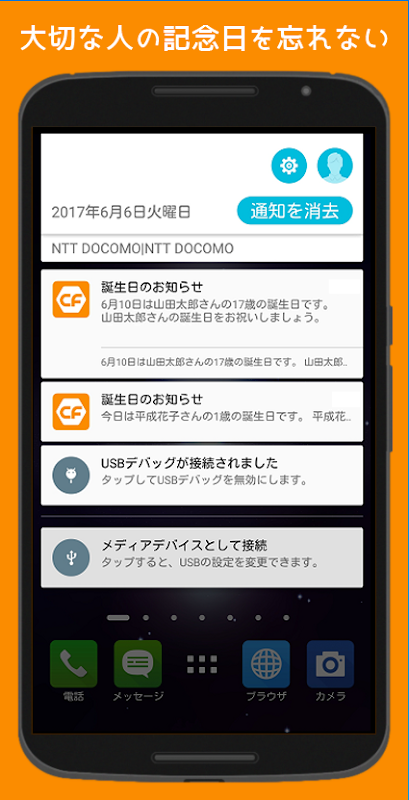 Chỉ cần nhập tên và ngày sinh của bạn, bạn sẽ được thông báo về các ngày sinh nhật, ngày kỷ niệm như Shichigosan và Ngày trưởng thành. Bằng cách tạo sự kiện tùy chỉnh, bạn cũng có thể tạo các sự kiện thông thường, chẳng hạn như các buổi họp mặt chỉ dành cho con gái và lễ kỷ niệm ngày cưới. Việc nhập dữ liệu một lần sẽ dễ dàng hơn so với việc sử dụng ứng dụng lịch mỗi lần và có thể tạo các sự kiện với các điều kiện phức tạp như "lặp lại Chủ nhật thứ hai ba tháng một lần".