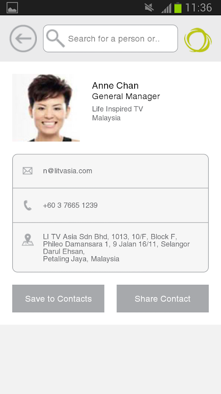 Tap to instantly call, email, view a company website or locate an office on a map.