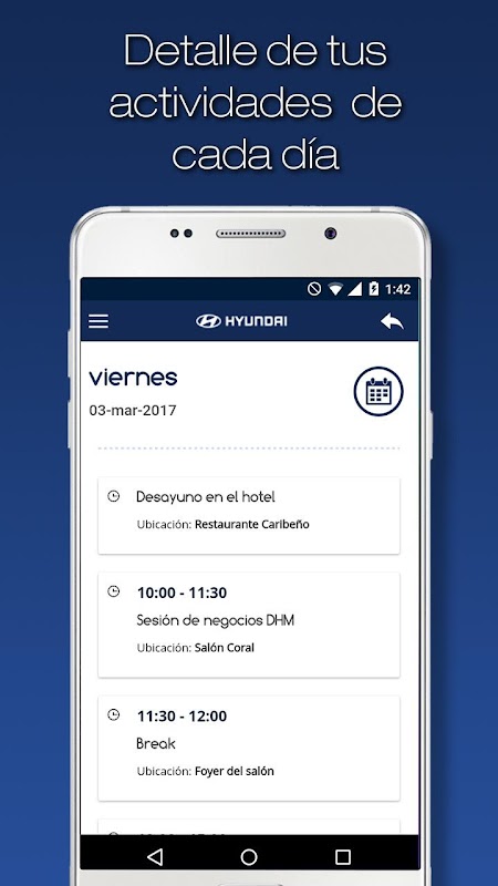 La aplicación de Convención Distribuidores Hyundai México permitirá a los asistentes del evento mantenerse al tanto con la información de la agenda, lugares y actividades del evento, atracciones del lugar e información de los restaurantes. Los usuarios también podrán revisar la información del clima actual en el lugar del evento, información del hotel, así como las recomendaciones para la vestimenta. Descarga esta aplicación gratuita y obtén la información actualizada del evento en la palma de tu mano!
