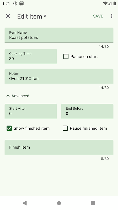 Chỉ cần tạo một bữa ăn bằng cách thêm từng bước nấu với thời gian nấu riêng và tùy ý đặt thời gian bắt đầu sau (trì hoãn) và kết thúc trước thời gian (nghỉ).
