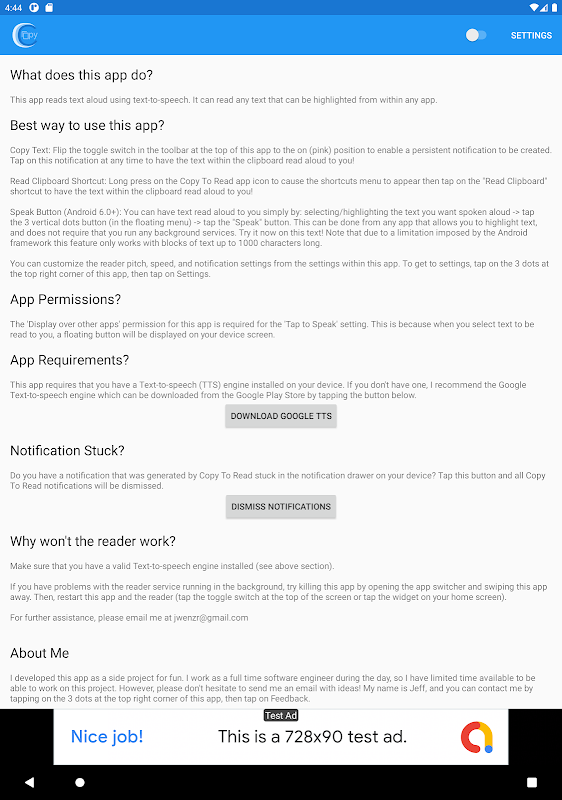Với Copy To Read - Text to Speech, chỉ cần sao chép một số văn bản, sau đó nghe như văn bản bạn đã sao chép được đọc lại cho bạn thông qua văn bản để nói. ứng dụng đọc văn bản này có thể đọc văn bản từ bất kỳ ứng dụng, miễn là các khoản tài trợ ứng dụng bạn khả năng sao chép văn bản mà bạn muốn được nói. Nó không thể được bất kỳ văn bản dễ dàng hơn để có đọc to cho bạn. Không cần phải nhập văn bản vào một ứng dụng để có nó đọc cho bạn. Trong khi văn bản được đọc cho bạn, một thông báo sẽ được hiển thị mà bạn có thể nhấn vào đó để dừng đọc bất cứ lúc nào hoặc bấm vào nút tạm dừng để tạm dừng đọc. Bạn cũng có thể nhấp vào bỏ qua phía trước và nút lùi vào thông báo để bỏ qua câu trong văn bản bạn đã sao chép. Vì vậy, không cần phải lo lắng về việc vô tình sao chép văn bản mà bạn không muốn được nói chuyện với bạn thông qua văn bản để nói.