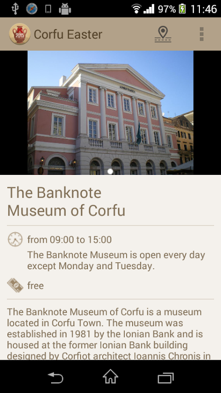 Η εφαρμογή είναι δωρεάν και μετά την εγκατάστασή της ΔΕΝ απαιτεί δεδομένα μέσω κινητής τηλεφωνίας ή wifi. Σας ενημερώνει εγκαίρως για τα δρώμενα που θα συμβούν ώστε να μη χάσετε τίποτα από το Κερκυραϊκό Πάσχα ενώ διαθέτει εγγενώς γεωχωρικές πληροφορίες ώστε να απαντά σε ερωτήματα: Πού είμαι; Πώς πάω στο ...;