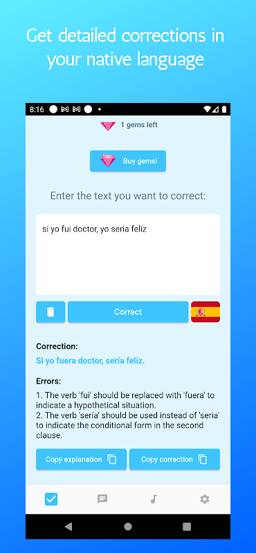 Correct me! is an app that corrects every sentence you put in any language and explains the error to you in your native language so you can learn and improve your language learning!