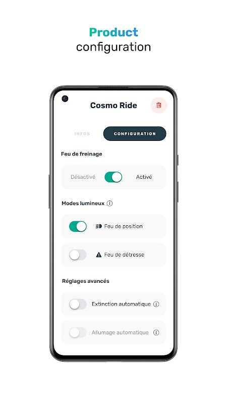 1 - Cấu hình và kiểm soát các sản phẩm Cosmo Connected: Ứng dụng cho phép người dùng định cấu hình và tùy chỉnh cài đặt của các sản phẩm Cosmo Connected của họ. Bạn có thể xác định tùy chọn ánh sáng, kích hoạt các tính năng an toàn như cảnh báo rơi và điều chỉnh các cài đặt khác theo nhu cầu của bạn.